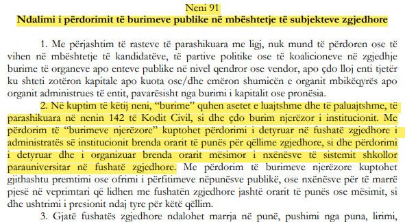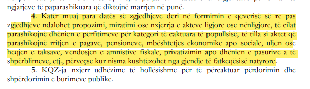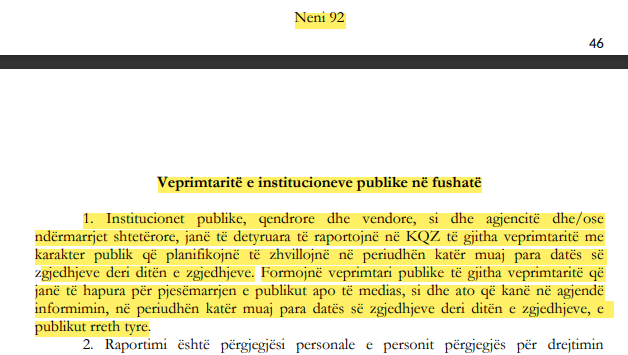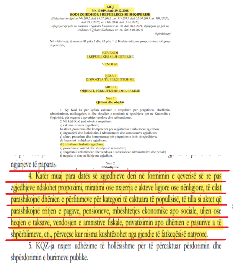 E ritheksojmë këtë fakt pasi jemi në fushatë zgjedhore dhe Kryeministri Edvin Rama është i pari që nuk përfill Kodin Zgjedhor të RSH, i cili, i miratuar nga Kuvendi Popullor, shpreh: 4. Katër muaj para datës së zgjedhjeve deri në formimin e qeverisë së re pas zgjedhjeve ndalohet propozimi, miratimi ose nxjerrja e akteve ligjore ose nënligjore, të cilat parashikojnë dhënien e përfitimeve për kategori të caktuara të popullsisë, të tilla si aktet që parashikojnë rritjen e pagave, pensioneve, mbështetjes ekonomike apo sociale, uljen ose heqjen e taksave, vendosjen e amnistive fiskale, privatizimin apo dhënien e pasurive a të shpërblimeve, etj., përveçse kur nisma kushtëzohet nga gjendje të fatkeqësisë natyrore.