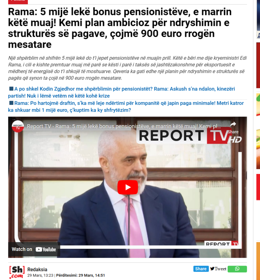 Eksiola Shehu, Euronews Albania (38 sek): – Zoti Rama a mund të na tregoni diçka më shumë për sa i takon programit të pagave, a do të ketë një rritje tjetër pas datës 1 Prill ku do të aplikohet paga minimale prej 40.000 lekë brenda këtij viti… dhe së dyti ju thatë se herën e ardhshme kur pensionistët do të marrin edhe pensionin e tyre ata do të marrin edhe shpërblimin nqs do ta konsideroj të tillë. A jeni në shkelje të Kodit Zgjedhor i cili nuk lejon që qeveria katër muaj përpara zgjedhjeve të bëjë shpërblime të tilla, të ulë taksat dhe të ndikojë në këtë mënyrë tek qytetarët?