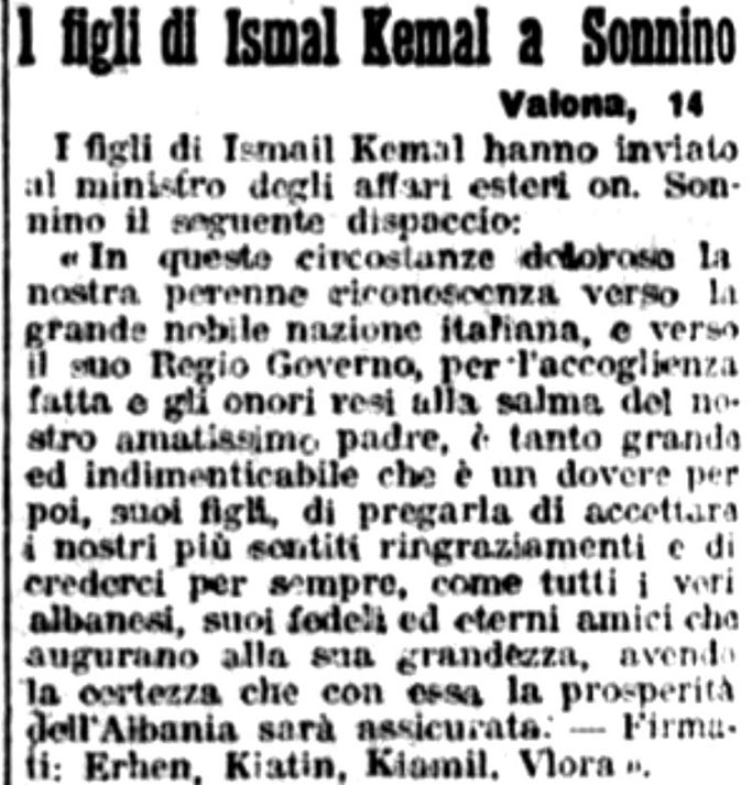 Gazzetta di Venezia (1919)- Shkresa e djemve të Ismail Qemalit drejtuar ministrit të Punëve të Jashtme të Italisë me rastin e vdekjes së babait të tyre