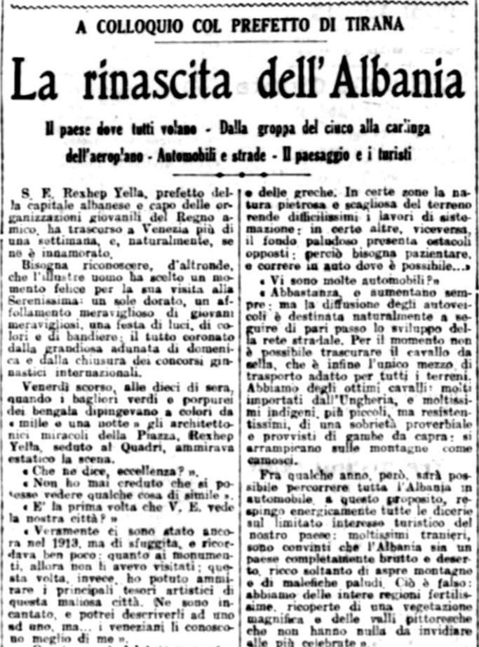“Gazzetta di Venezia” ka botuar, të enjten e 21 majit 1931, në faqen n°3, bisedën ekskluzive me prefektin e Tiranës, Rexhep Jellën, askohe për vizitë në qytetin e Venecias, të cilën, Aurenc Bebja, nëpërmjet blogut të tij “Dars (Klos), Mat – Albania”, e ka sjellë për publikun shqiptar :