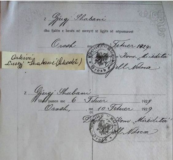 Me mbarimin e kësaj shkolle, Ministria e Arsimit, me dekretin nr. 41 Tiranë, 24. IX. 1929, e emnon Gjergj Shabanin mësues në shkollën e Konviktit “Mirdita” në Orosh, me rrogë mujore 120 franga ari. I emnuemi porositet me u gjetë në krye të detyrës më 15 të atij muej, pse me 20 do të fillojnë mësimet rregullisht. Dokumenti nr. 1/1. Drejtori i Konviktit: Ejell Ndoca.