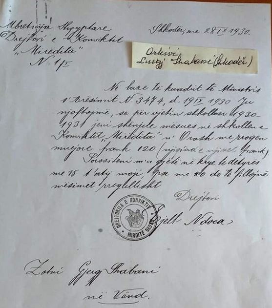 E dyta. I emnuemi prej Ministrisë s’Arsimit, me qarkoren nr. 4433, dt. 18. IX.1929, mësues në Fand, me rrogën mujore franga ar 120, u transferue mësues në Konviktin “Mirdita” po me atë rrogë, me shkresën e Ministrisë në fjalë, nr. 4247, dt. 21. IX.1929, për mungesë personelit në këtë konvikt.