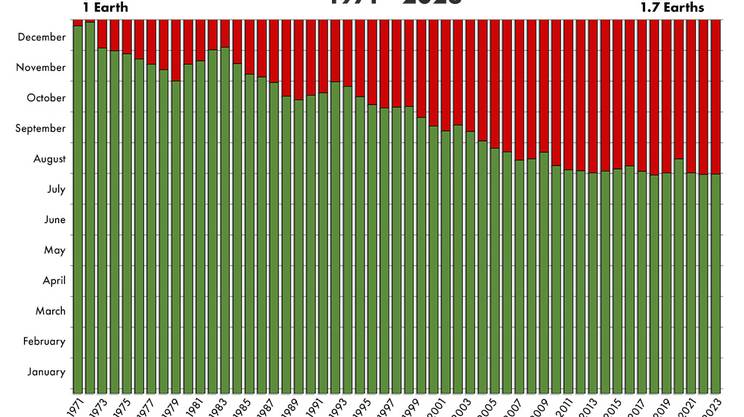 Në vitin 1970, marrëdhënia midis kapacitetit të Tokës dhe gjurmës ekologjike të njerëzimit lejoi arritjen e muajit dhjetor, nga vitet 1980 e në vazhdim kjo datë gradualisht i është afruar mesit të vitit. Vetëm në vitin 2020, vit i shënuar nga pandemia, data u shty me një muaj dhe është e nevojshme ta kujtojmë atë në mënyrë që të ndërgjegjësohet për rreziqet që lidhen me varfërimin e burimeve natyrore për brezat e ardhshëm. rsi-eb