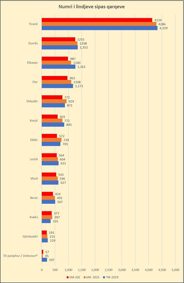 GRAFIKU: Tkurret numri i lindjeve në vend, Dibra dhe Korça kryesojnë në 6-mujorin e parë të vitit