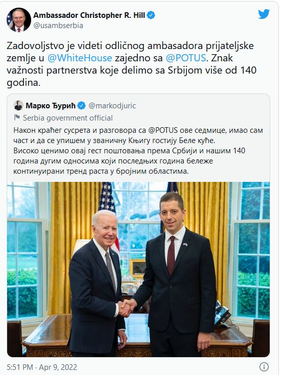 Hill për Gjuriqin: Kënaqësi ta shohësh një ambasador të shkëlqyer të një vendi mik në takim me Bidenin