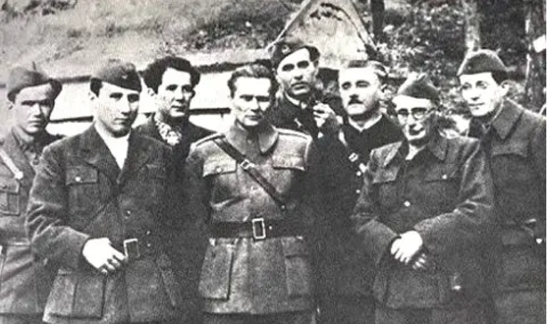 Sllavko Alleksiq (rreshti i parë, i dyti nga e djathta) me vullnetarë rusë në pozicion mbi Sarajevë. Data e fotografisë nuk dihet.