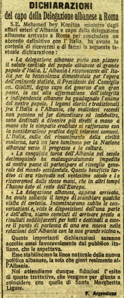 Shkëlqesia e Tij Mehmet bej Konica, ministër i Punëve të Jashtme të Shqipërisë dhe kryetar i delegacionit shqiptar që mbërriti në Romë për të lidhur një marrëveshje përfundimtare me Italinë, pati mirësinë të më priste dhe të më bënte fjalë për fjalë deklaratën e mëposhtme :