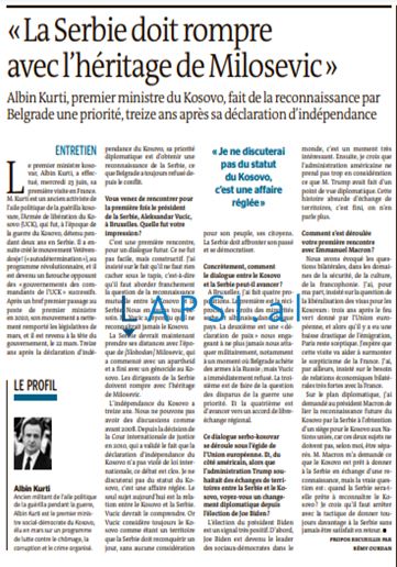 Gazeta le monde e së shtunës pasdite ka botuar një intercistë të gazetarit të saj që mbulon Ballkanin Remy Urdin me kryeministrin e Kosovës Albin Kurti. Përgjigjet e Kurtit ishin interesante se ai fliste menjëherë pas fillimit të dialogut me presidentin serb Vuçiç dhe direkt pasi ka takuar shefin e shtetit francez Makron. E rëndësishme në këtë dialog, disa detaje të të cillit kanë dalë edhe në shtypin shqipfolës, por që Lapsi.al po e boton të plotë, është ideja e kryeministrit Kurti, për të mos dialoguar më për statusin e Kosovës, por për njohjen reciproke. Po ashtu interesant është fakti se gazetari e pranon që ka pasur një plan të administratës Trump për shkëmbim kufijsh por bashkëbiseduesi i tij e quan këtë kapitull të mbyllur. Kurti ka përsëritur edhe njëherë propozimin e bërë edhe në Bruksel që dy vendet të nënshkruajnë një “deklaratë paqeje” ku ata angazhohen të mos sulmojnë kurrë më ushtarakisht njëri tjetrin. Lajme të tjera nga intervista janë edhe ato se Franca ende është skeptike për liberalizimin e vizave dhe se në optikën e makron qëndron ende logjika që Serbisë i duhet bërë ndonjë lëshim për ta njohur Kosovën…
