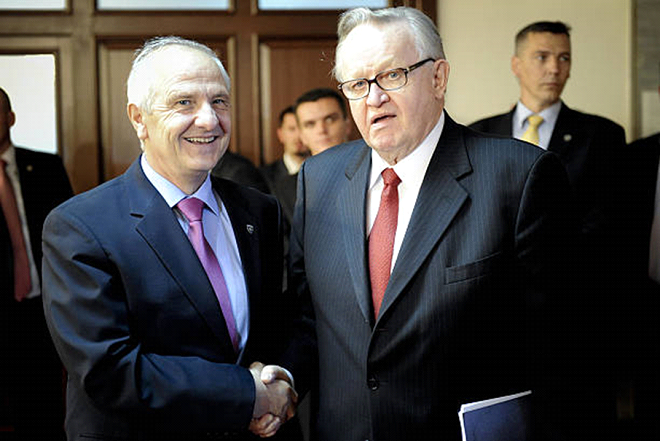 Prof.dr. Fatmir Sejdiu, në takime të shpeshta pune me z. Martti Ahtisaari, diplomat i shquar dhe ish- President i Finlandës, gjatë viteve 1994- 2000, ia del që ta bind atë, që çdo status tjetër përveç Pavarësisë së Kosovës, çon në gjakderdhje të re.