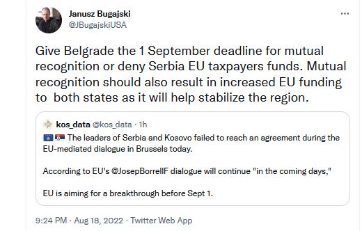 Janusz Bugajski: Jepini Beogradit afatin 1 shtator për njohjen reciproke
