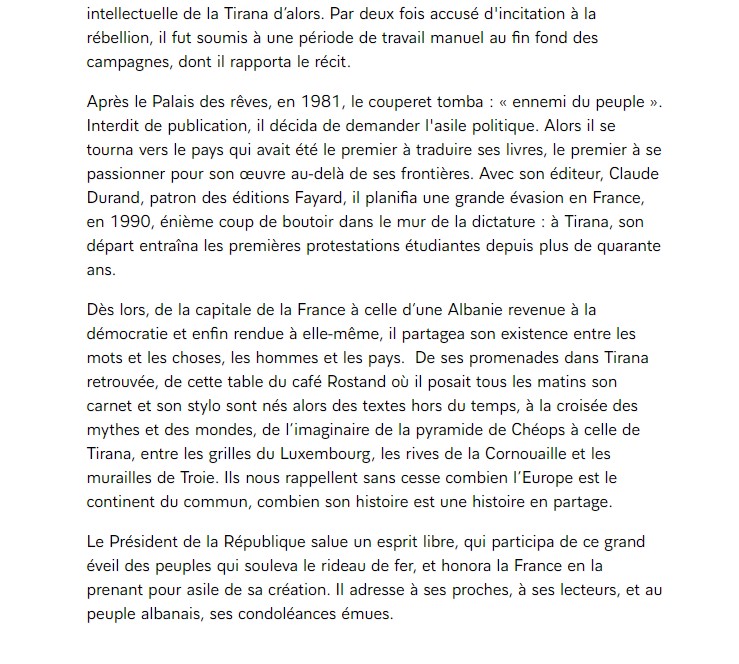 Presidenti i Republikës përshëndet një shpirt të lirë, i cili mori pjesë në këtë zgjim të madh të popullit që ngriti perden e hekurt dhe nderoi Francën duke e marrë atë si azil të krijimit të tij. Ai u drejton ngushëllimet e tij të përzemërta të dashurve të tij, lexuesve të tij dhe popullit shqiptar”.