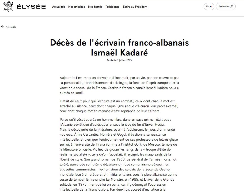 “Vdiq një shkrimtar që mishëroi, me jetën, me veprën dhe me personalitetin e tij, pasurimin e dialogut, forcën e shpirtit europian dhe vokacionin mikpritës të Francës. Shkrimtari franko-shqiptar Ismail Kadare u largua nga ne këtë të hënë. Ai ishte një nga ata për të cilët shkrimi është një luftë; ata që çdo fjalë u shkëputet nga heshtja, ata që çdo rresht rrezikon t’u shtohet minutave, ata që çdo roman kërcënon të jetë epitafi i karrierës së tyre.