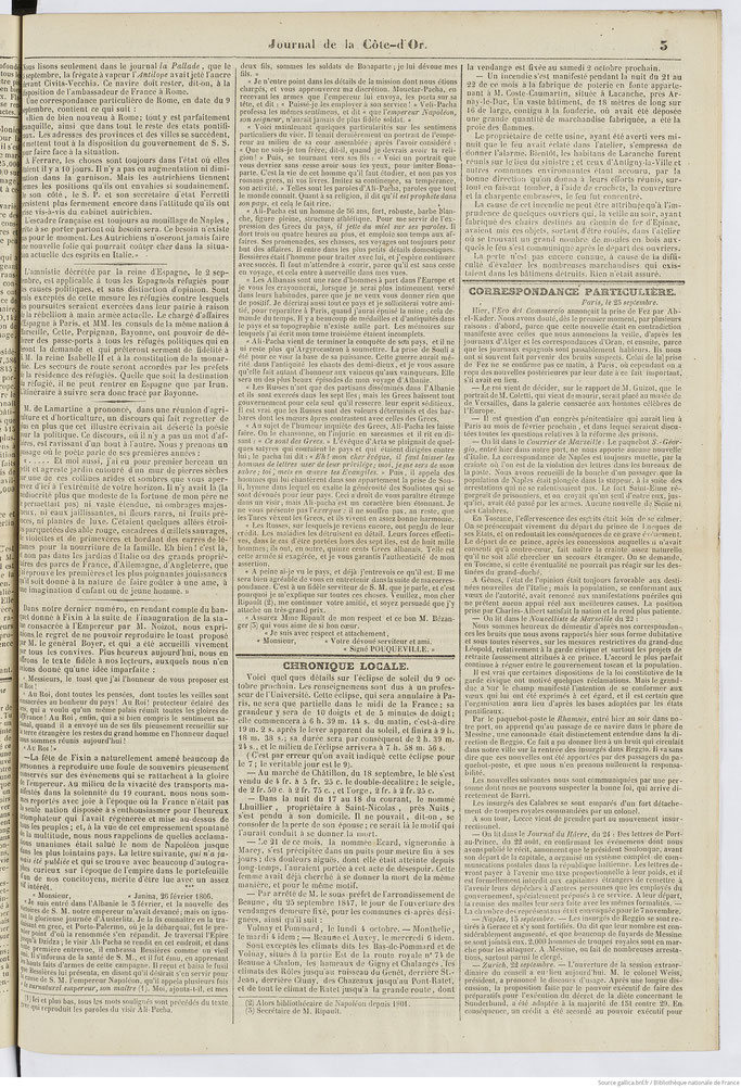 — Festa e Fixin-it ka bërë natyrshëm shumë njerëz të riprodhojnë një mori kujtimesh të ruajtura në mënyrë të devotshme të ngjarjeve që lidhen me lavdinë e perandorit. Mes gjallërisë së transporteve të manifestuara në solemnitetin e datës 19 (shtator), ne kthyem sytë pas me gëzim në kohën kur Franca nuk ishte i vetmi komb i prirur të entuziazmohej për triumfuesin e lumtur që e kishte ripërtërirë dhe e kishte vendosur mbi të gjithë popujt; dhe, me shikimin e këtij entuziazmi spontan të turmës, ne kujtuam se me çfarë brohoritje unanime u përshëndet emri i Napoleonit edhe në vendet më të largëta. Letra e mëposhtme, e cila nuk është botuar kurrë më parë dhe që gjendet me shumë autografe kureshtare për epokën e perandorisë në portofolin e një bashkëqytetari tonë, meriton të lexohet me mjaft interes.
