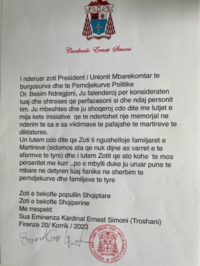 Kardinali Ernest Simoni Troshani mbështet misionin e ngritjes së Murit të Kujtesës në Tiranë