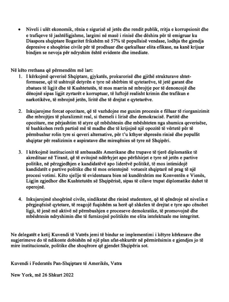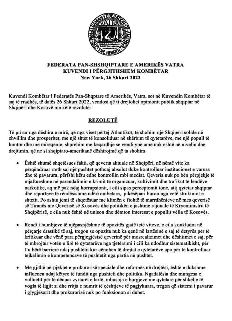 Kjo Rezolutë u miratua në Kuvendin e Përgjithshëm të Vatrës, por u bllokua nga Kryetari i zgjedhur i Vatres Nga Valentin Lumaj