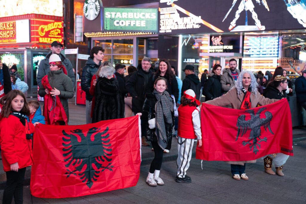 Për një orë të tërë Times Square në qendër të saj u mbush me flamujt kuq e zi dhe bë një “Shqipëri e Vogël” në zemër të Nju Jorkut. Flamujt kuq e zi valëviteshin krah për krah me Stars and Stripes si simbol i dashurisë së dyfishtë për vendlindjen dhe për Amerikën që na strehoi. Atmosfer festive, dhe britmat “Jam krenar me qenë Shqiptar!” dhe Albania! Albania! “USA! USA!”, u bashkuan në një kor të vetëm në Times Square.