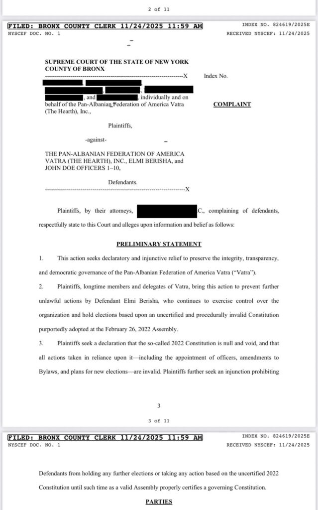 Zyrtarë të Federatës Vatra padi në Gjykatën Supreme të New York-ut kundër kryetarit të Vatrës Elmi Berisha – Kërkojnë masë ndaluese!