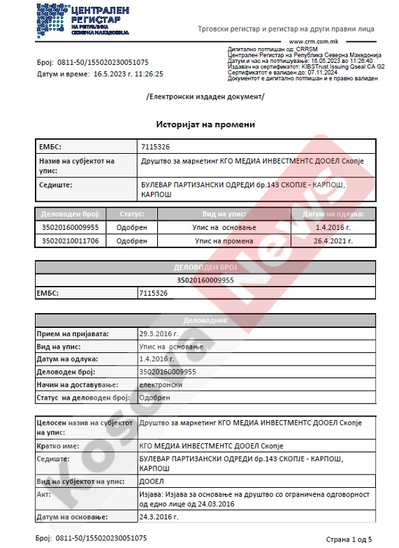 Pronësia e Klan Kosovës kalon në Maqedoni te kompania “KGO MEDIA INVESTMENT” DOOEL me pronar Kushtrim Gojanie regjistruar me pasaportë serbe