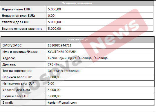 Sipas kërkesave dhe të dhënave që kemi nxierrë nga Agjencioni Qëndror i Regjistrit në Maqedoni kjo kompani është në pronësi të Kushtrim Gojanit të cilën Gojani e ka të regjistruar me pasaportë Serbe e ku si adresë i figuron Gjakovë, “Serbi” (srb./maq. “Djakovica, Serbia” Në certifikaten e regjistrimit të Maqedonisë përshkruhet si investim i huaj nga Serbia.