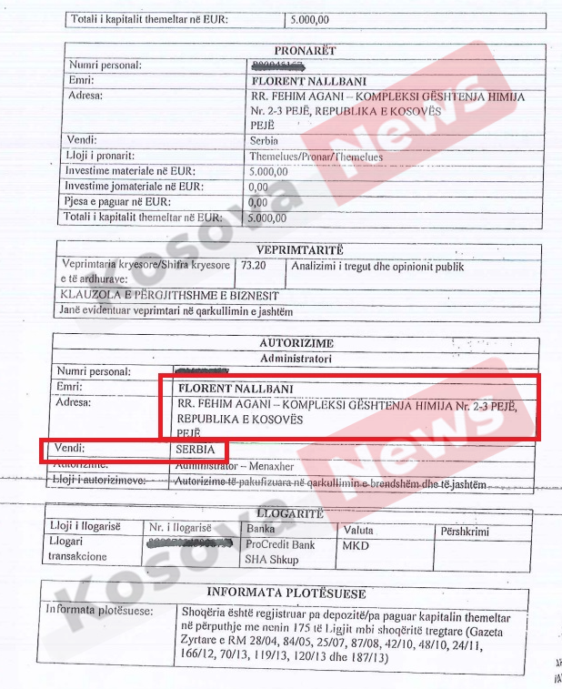 Sipas të dhënave të regjistrit tregtar të Maqedonisë së veriut (crm.com.mk) edhe kompania “K-Media Corporation Dooel” ishte pronë e Florent Nallbanit, të cilën adresa e këtij të fundit figuronte si “Peç Serbia” (srb./maq. Pejë, “Sebi”), ndërsa në certifikaten e regjistrimit të kësaj kompanie, figuron të jetë një investim i huaj nga Serbia!?