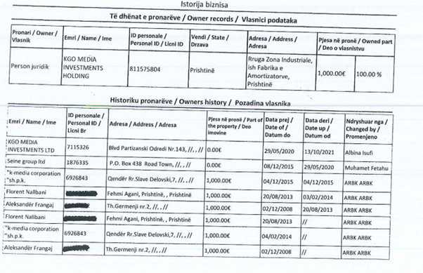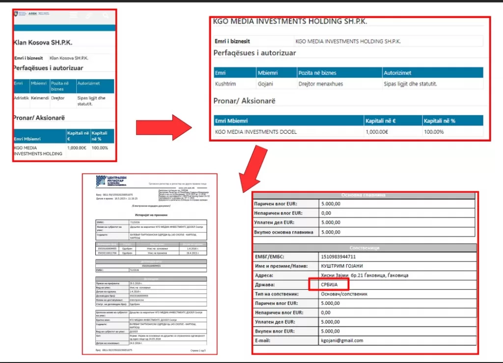 të kompanisë “KGO MEDIA INVESTMENT” DOOEL me pronar z. Kushtrim Gojanit, kompani e cila aktualisht e ka në pronësi Klan Kosova Sh.P.K të dhënat e pronarit figurojnë se është shtetas i Serbisë me adresë “Djakovica, Serbia”.