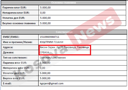 Po, Po. Nga Serbia, ku adresa a pronarit figuron si: “Ul. Hisni Zajmi, Djakovica, Serbia”. Pra sipas të dhënave zyrtare pronar “me letra” i Klan Kosovës rezulton të jetë z. Kushtrim Gojani, i cili pronësinë e Klan Kosovës e ka në një kompani me veprimtari hollding në Maqedoninë Veriore. Gojani këtë kompani e ka regjistruar si investim i huaj nga Serbia, ku si adresë e tij në cilësinë e pronarit dhe drejtorit figuron: Rr. Hysni Zajmi në Gjakovë, Serbi , por që qyteti jug-perendimor i Kosovës , sipas akteve ligjore që i njëjti i ka nënshkruar, na qenka në Serbi.