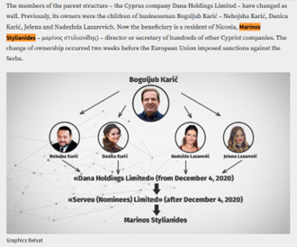Gjithashtu, avokati Marinos Stylianides ishte sekretar i kompanisë dhe mbajtës i aksioneve të kompanisë “Seine Group LTD” kompani që e kishte në pronësi Klan Kosova “Sh.P.K”. Nga viti 2015-2020 Marinos Stylianides figuron edhe tek një skandal i fshehjes së pasurisë nga e bija e diktatorit Bjellorus dhe aleatit të Putinit, Aleksander Lukashenko dhe familjes Kariç, me origjinë nga Peja. Familja Kariç ishte e afërt me kasapin e Ballkanit Sllobodan Millisheviç. Bogolub Kariç perandorinë e tij biznesore e ngriti gjatë kohës së regjimit të Sllobodan Millosheviçit duke ngritur biznese të fuqishme si ato të telefonisë mobile (Mobtel), banka dhe kompani ndërtimore, ai u arratis nga Serbia dhe për 10 vite me radhë gjeti strehë në Bjellorusi tek miku i tij diktatori Llukashenko.