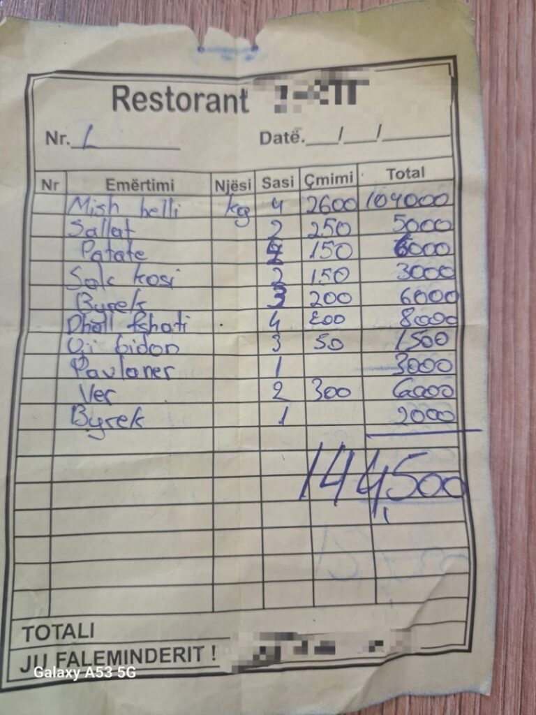 Po sjellim faturën e një dreke në një restaurant të Shqipërisë, natyrisht jo nga ato lluksozët.