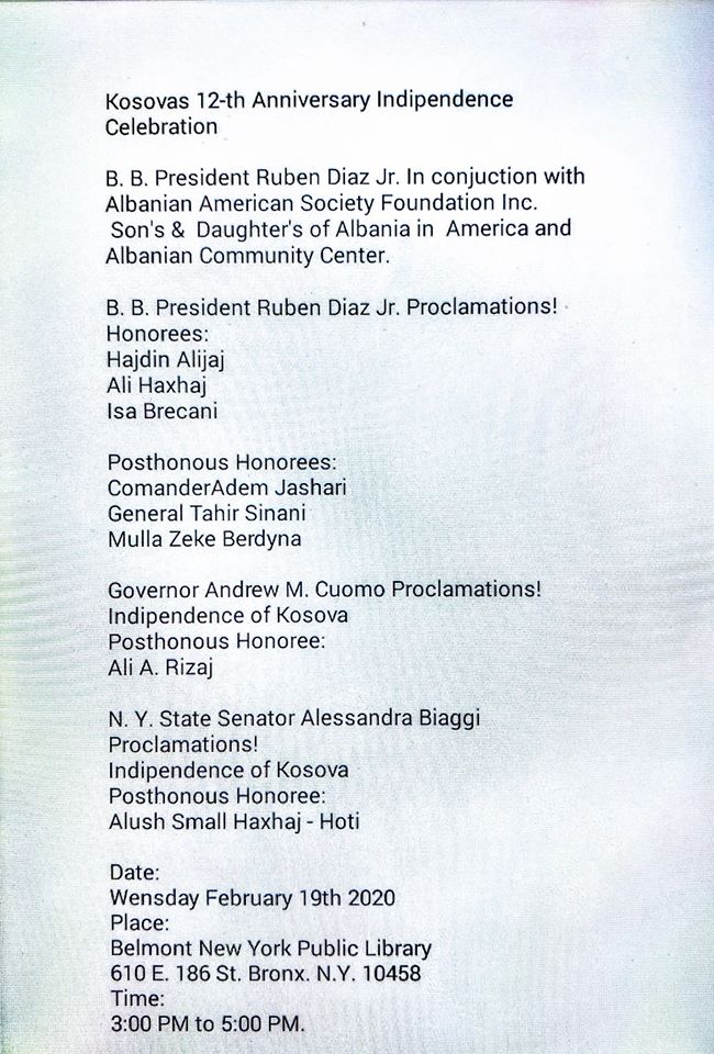 Kremtime për 12 vjetorin e pavarësisë të Kosovën në praninë e Guvernatorit të NY Andrew M.Cuomo & kryetarit të bashkisë të Bronx Borough Ruben Diaz Jr.