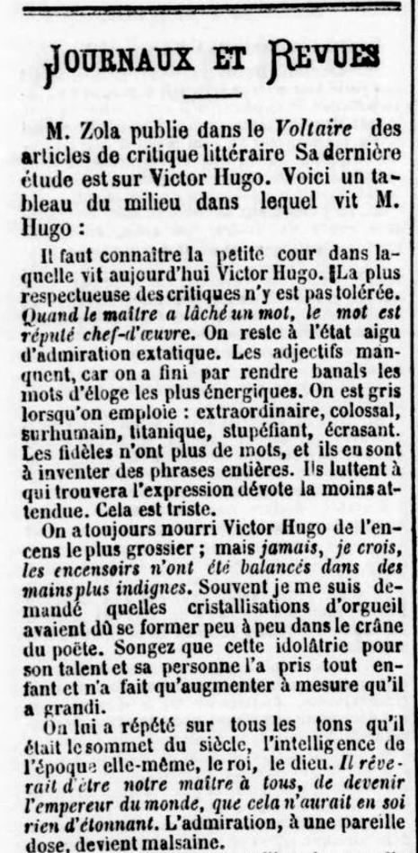 Kritika letrare e 1879 – Emile Zola për Victor Hugonë: “Sa më madhështor bëhet, aq më të zbrazët bëhen rreshtat e tij !”