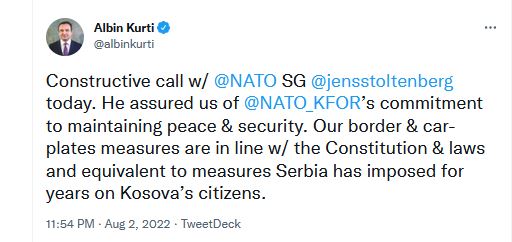 Kryeministri i Kosovës Albin Kurti pas telefonatës me SP të NATO-s: Stoltenberg na siguroi angazhimin e NATO-s & KFOR-it për ruajtjen e paqes & sigurisë