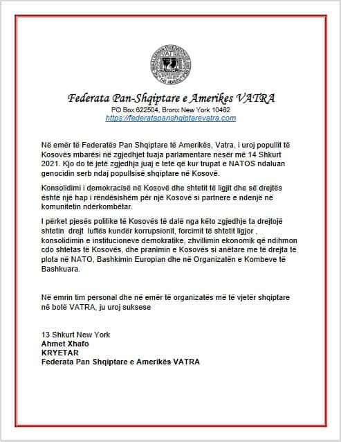 Kryetari Ahmet Xhafo, në emër të Vatrës i uron popullit të Kosovës mbarësi në zgjedhjet parlamentare