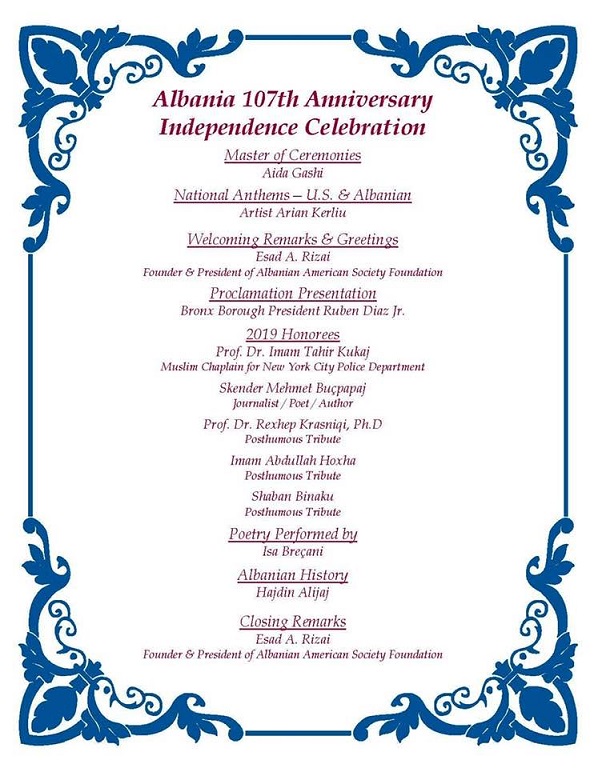 Në fillim u kënduan dy Himnet Kombëtare, ai Shqiptar dhe ai Amerikan. Presidenti i Komunitetit, Edon Shaqiri, pasi do t’i uronte mirëseardhjen të githëve, do të fliste për rëndësinë e kësaj date dhe lavdinë e saj dhe do t’ia jepte fjalën “të Ftuarit të Nderit”, shkrimtarit Visar Zhiti.
