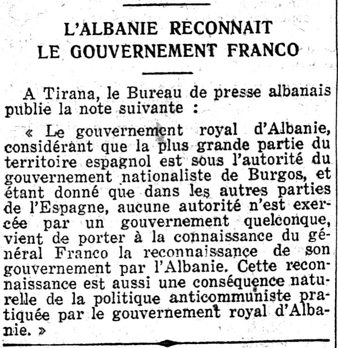Kur mbretëria shqiptare njihte qeverinë e gjeneralit Franko të Spanjës (1936)
