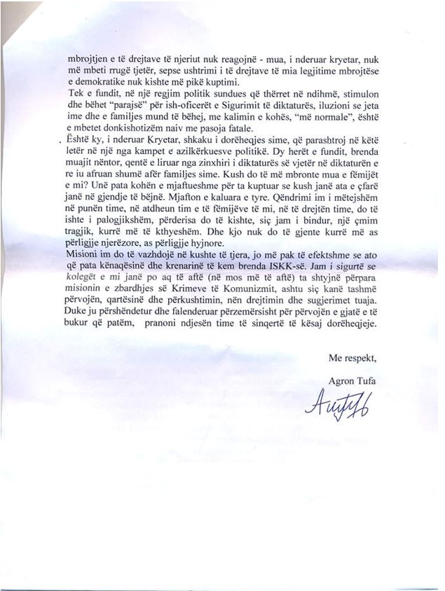 Më poshtë mund të lexoni letrën e plotë të skanuar të Agron Tufës drejtuar Kryetarit të Bordit të ISKK, me dijeni për Presidentin e Republikës së Shqipërisë, Z. Ilir Meta, Z. Gramoz Ruçi, Kryetar i Kuvendit të Republikës së Shqipërisë dhe Znj. Arta Marku, Prokurore e Përgjithshme e Republikës së Shqipërisë.