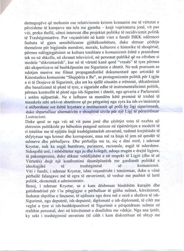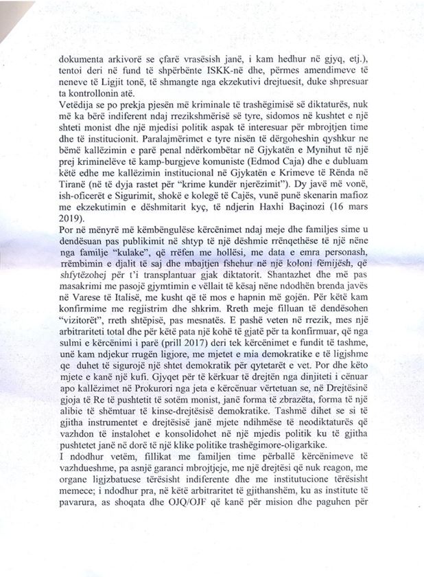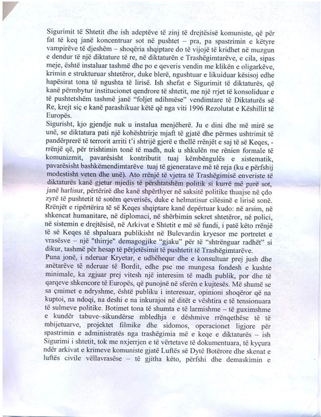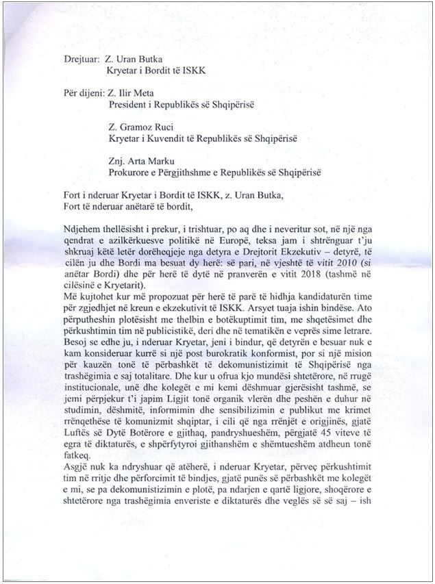Më poshtë mund të lexoni letrën e plotë të skanuar të Agron Tufës drejtuar Kryetarit të Bordit të ISKK, me dijeni për Presidentin e Republikës së Shqipërisë, Z. Ilir Meta, Z. Gramoz Ruçi, Kryetar i Kuvendit të Republikës së Shqipërisë dhe Znj. Arta Marku, Prokurore e Përgjithshme e Republikës së Shqipërisë.