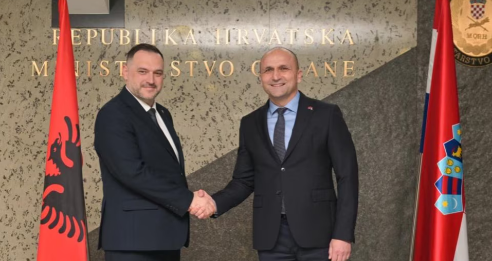 Ministri i Mbrojtjes i Shqipërisë, Ermal Nufi (majtas), takohet me homologun e vet kroat, Ivan Anushiq, në Zagreb, 15 prill 2026.