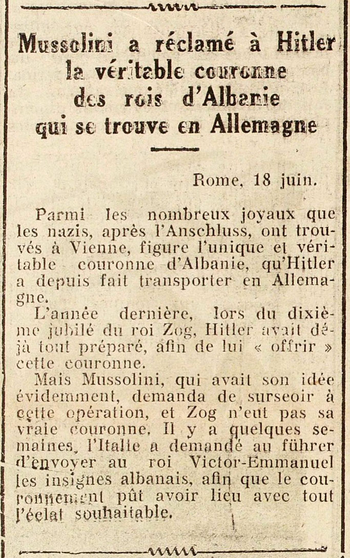 La Charente (1939) – Hitleri kishte planifikuar t’i dhuronte kurorën e Skënderbeut mbretit Zog, por Musolini i kërkoi që ta shtyjë këtë operacion