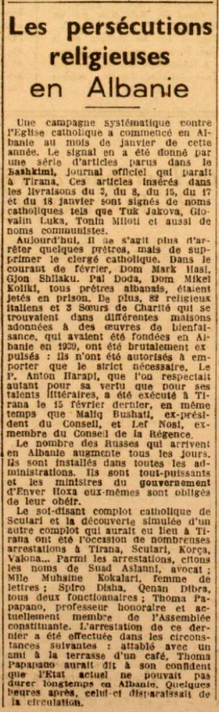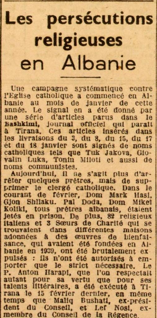 “La Croix” ka botuar, të enjten e 27 qershorit 1946, në faqen n°5, një shkrim rreth persekutimeve fetare e politike asokohe në Shqipëri, të cilin, Aurenc Bebja, nëpërmjet blogut të tij “Dars (Klos), Mat – Albania”, e ka sjellë për publikun shqiptar :