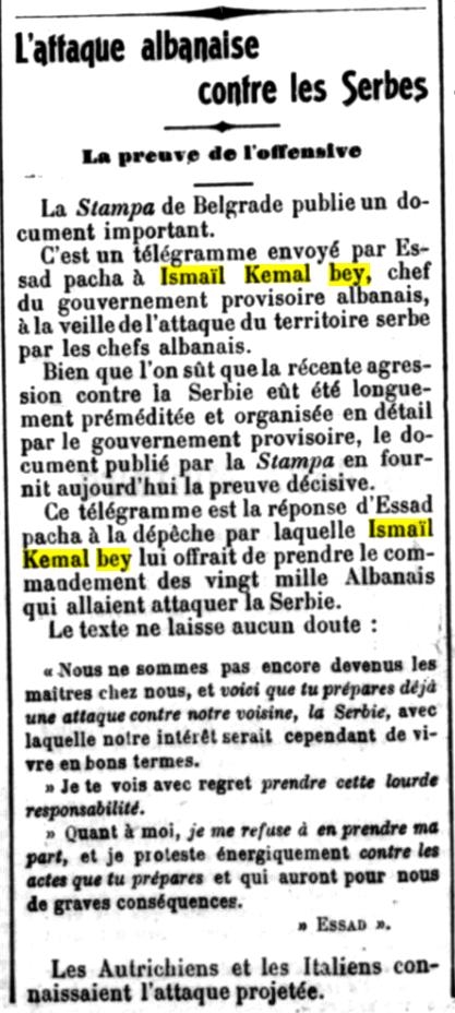 La Gazette de France (1913)- Telegrami i Esat Pashës drejtuar Ismail Qemalit : “Mos e sulmo Serbinë !”