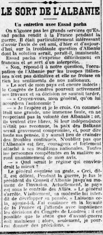 La Liberté (1920)- Esat Pasha: “Mos harroni se shqiptari është krenar, guximtar dhe i lidhur fort me traditat e tij kombëtare, prandaj Kongresi i Londrës…”
