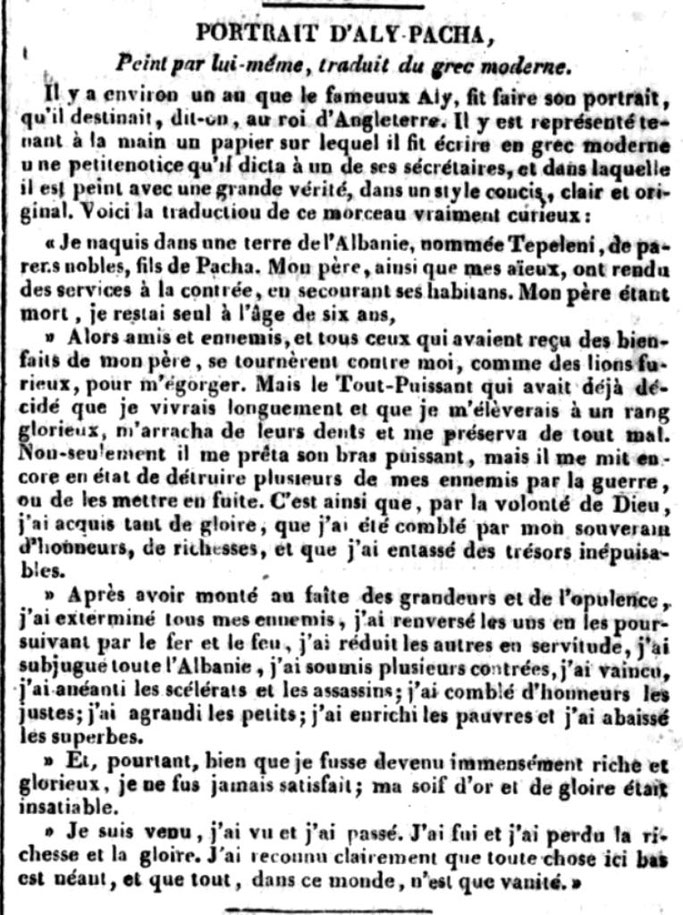 La Quotidienne (1821) Ali Pashë Tepelena – Mbretit të Anglisë: “Ja kush jam dhe sa kam arritur, por në këtë botë…”