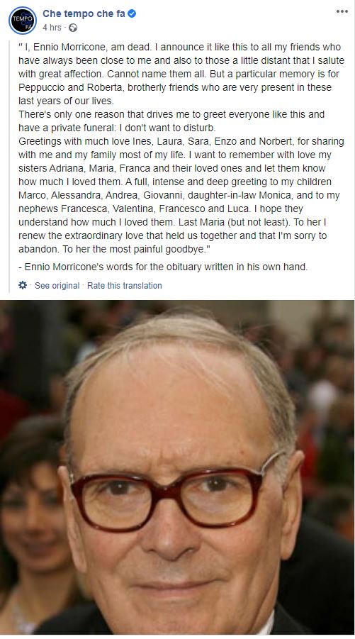Latumira e kompozitorit të madh: Unë, ENNIO MORRICONE, kam vdekur
