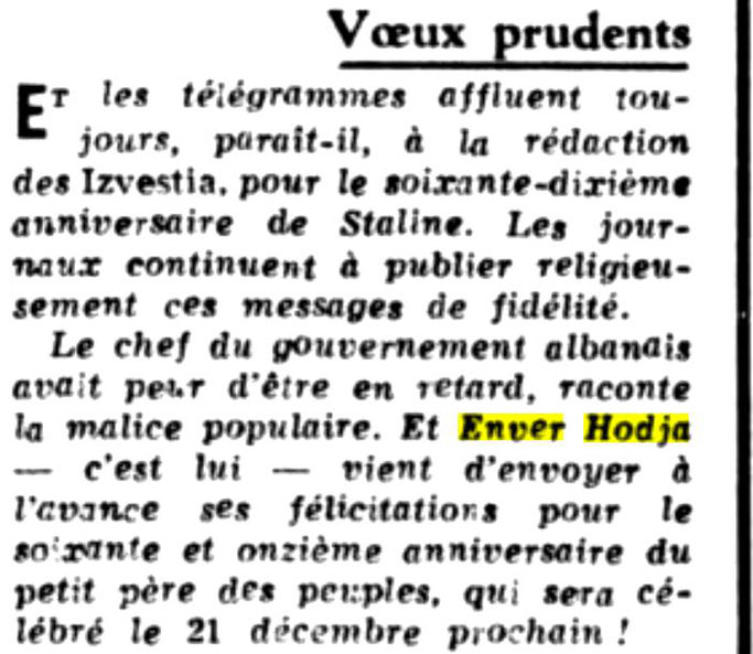 L’Aube (1950) – Enver Hoxha, nga frika se mos vonohej, e uroi para kohe Stalinin për 71 vjetorin !