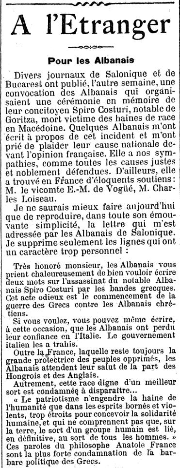 Le Figaro (1906)- Letra e shqiptarëve të Selanikut drejtuar politikanit dhe gazetarit francez: “Vrasja e Spiro Kosturit është fillimi i luftës së grekëve kundër shqiptarëve të krishterë.”