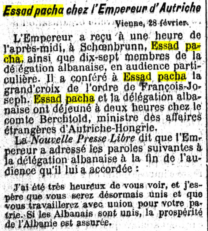 Le Figaro (1914)- Perandori austriak dekoroi Esat Pashën më kryqin e madh të urdhrit të Franz-Jozefit