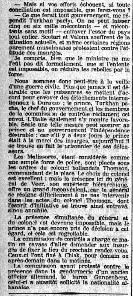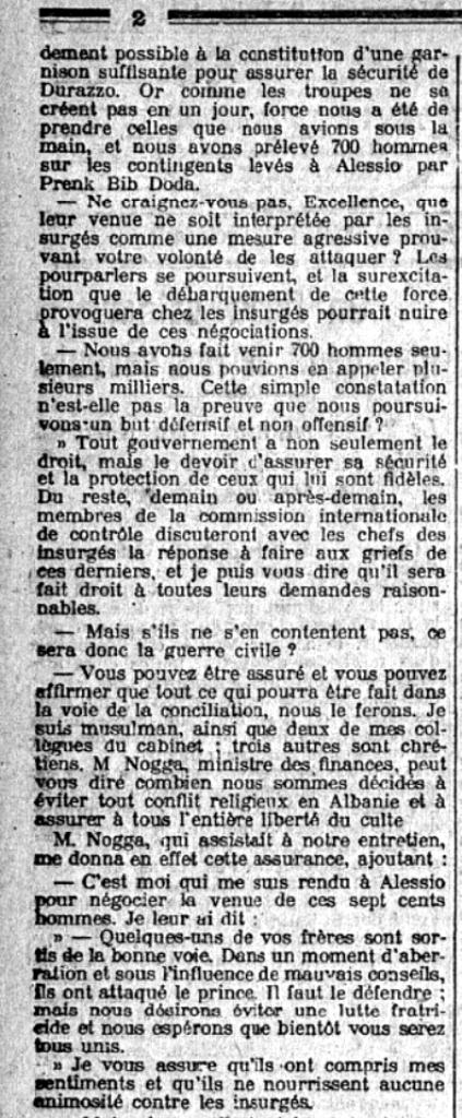 Le Matin (1914)- Intervista me Turhan Pashën dhe Filip Nogën pas Këshillit të Ministrave në lidhje me kryengritjen kundër Princ Vidit