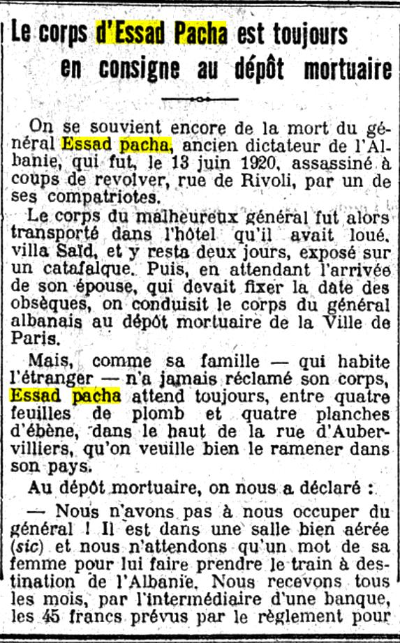 Le Matin (1921)- Më shumë së një vit pas vrasjes, trupi i Esat Pashës gjendet ende në morg, në fillim të rrugës Aubervilliers, në Paris