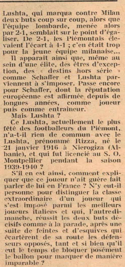 Le Miroir des sports (1942)- Fate të veçanta sportive: Riza Lushta, qendërsulmuesi shqiptar i Juventusit që luajti për S. O. Montpellier më 1939-40