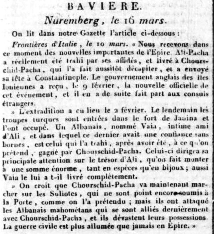 Le Moniteur Universel (1822)- Ali Pashë Tepelena u tradhtua nga njeriu më i afërt i tij, Thanas Vaja (Athanase Vaïa)